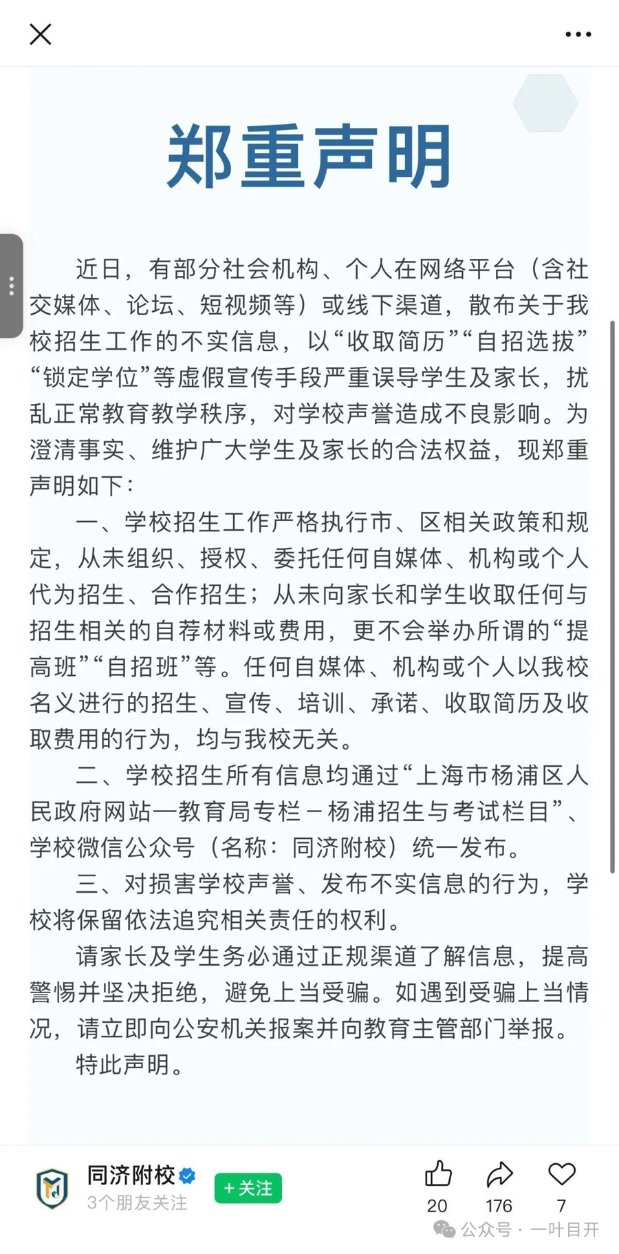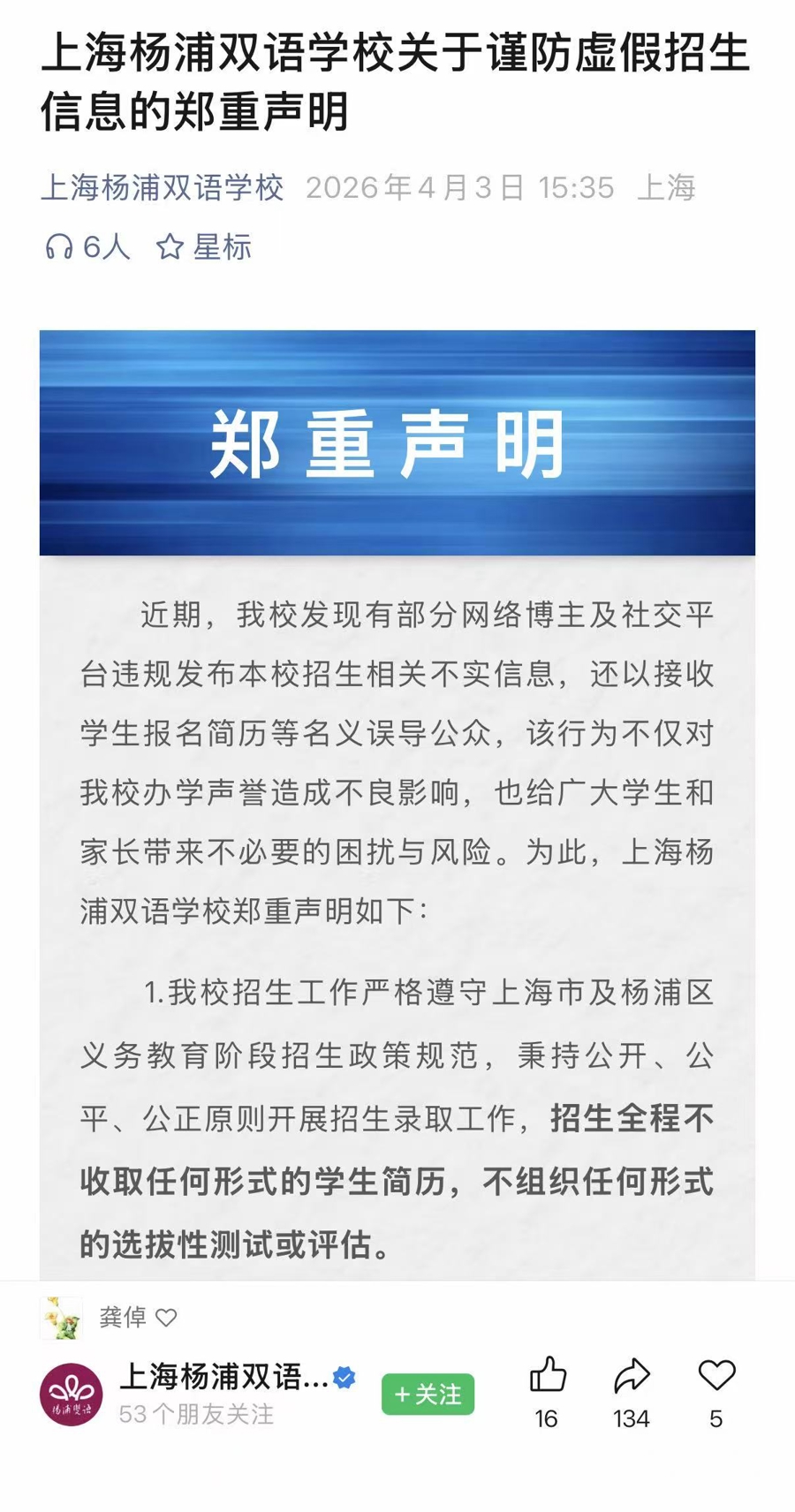 值得关注的是,上周,上海交通大学附属中学杨浦实验学校、上海杨浦双语学校、同济大学附属新江湾城实验学校等纷纷发布声明,辟谣提前招生、内部选拔、收取简历等不实信息,强调将严格遵守阳光招生政策。