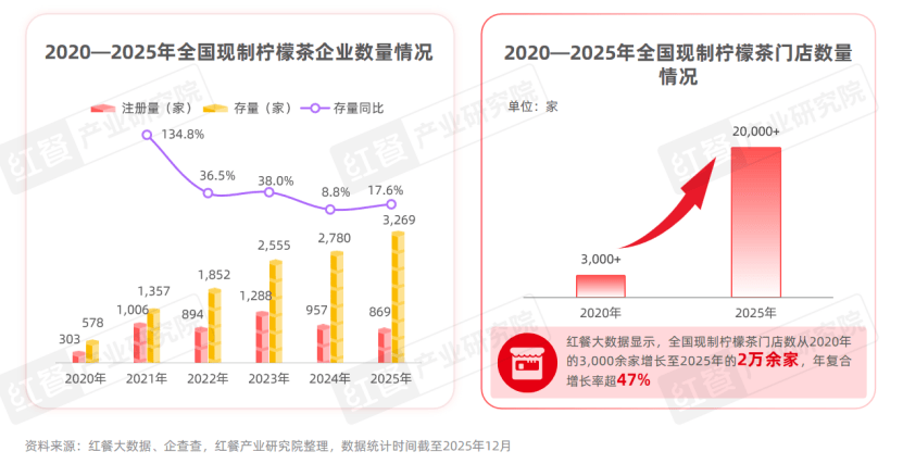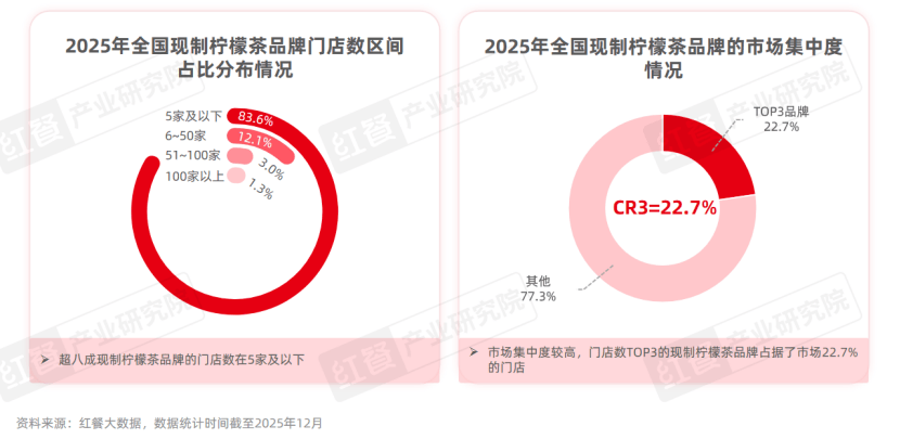 红餐大数据显示,全国现制柠檬茶的门店数从2020年的3000余家增长至2025年的2万余家,五年时间内增长约7倍,年复合增长率超过47%。行业连锁程度亦高企,市场上超50%的门店均为连锁品牌门店,门店数前三的品牌占据了22.7%的市场份额。